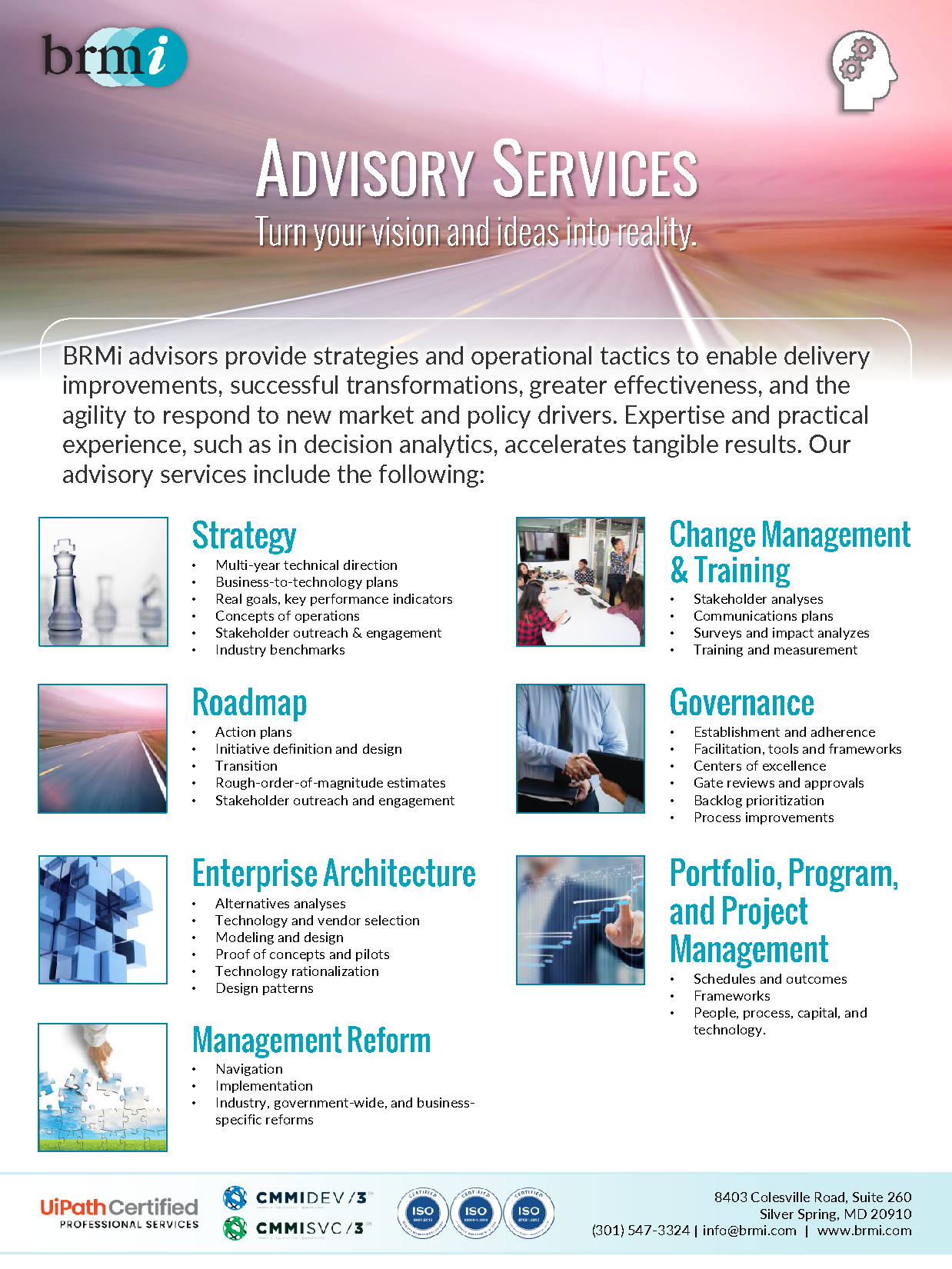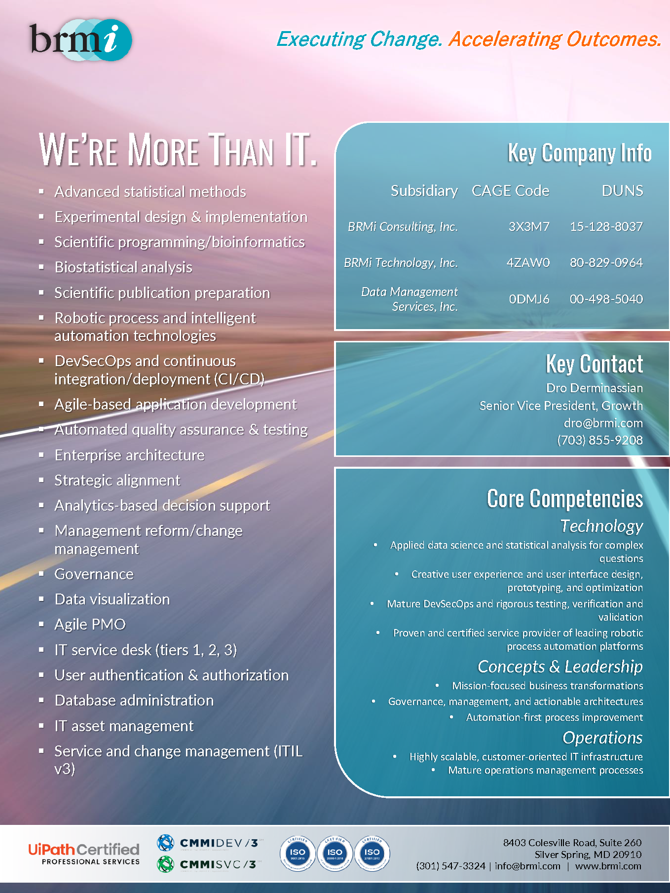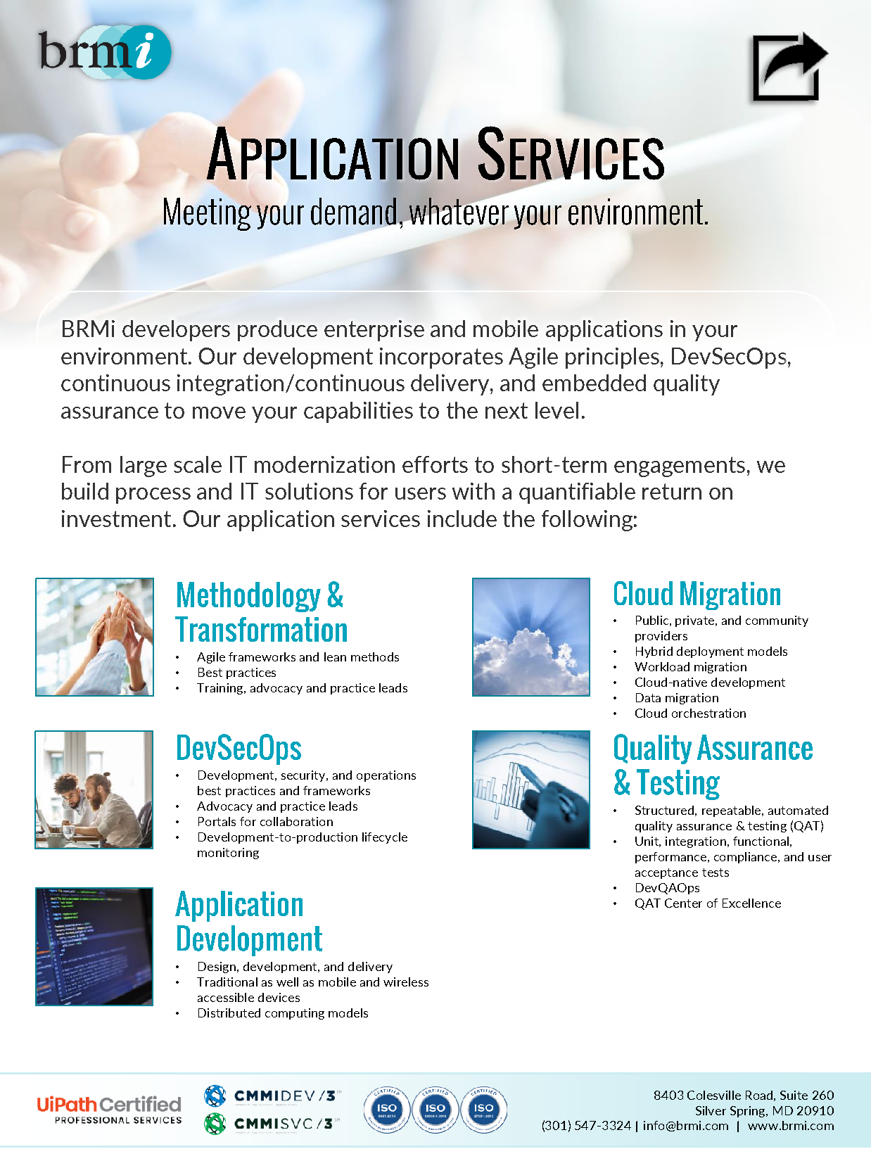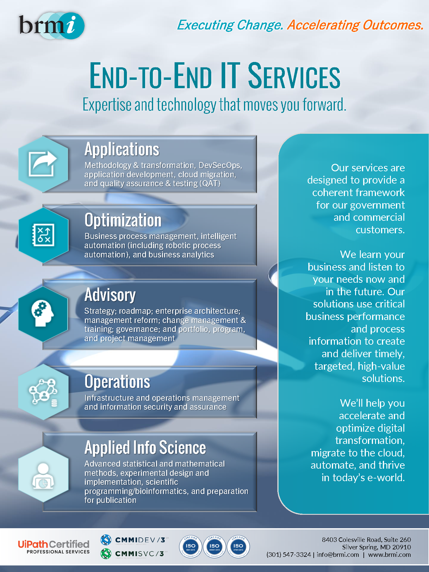 BRMi’s end-to-end information technology services are designed to provide a coherent framework for our government and commercial customers. We’ll help you accelerate and optimize digital transformation, migrate to the cloud, automate, and thrive in today’s e-world.