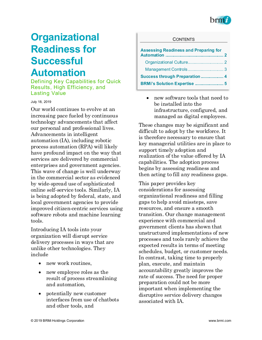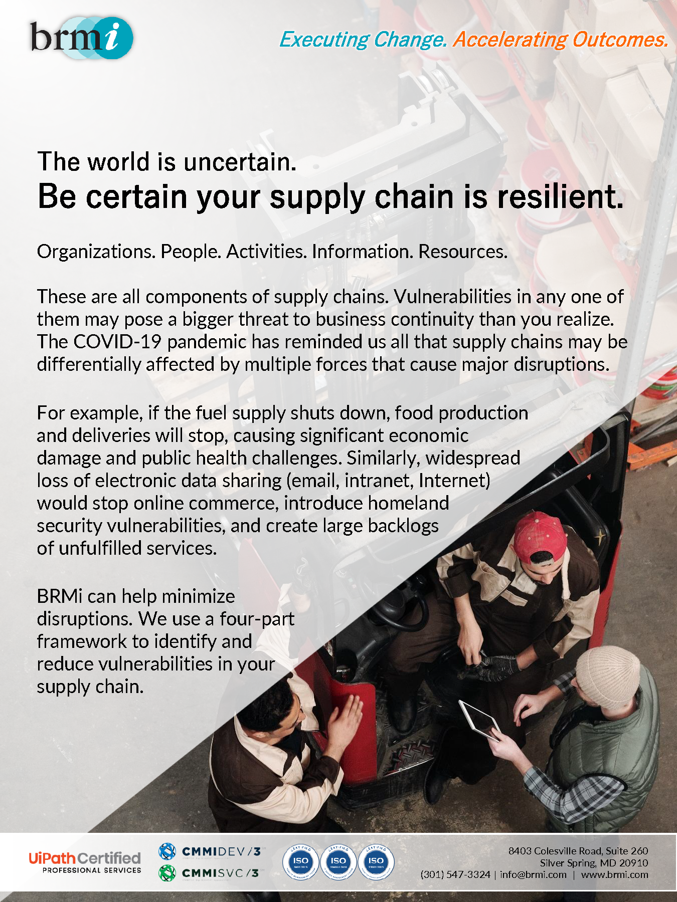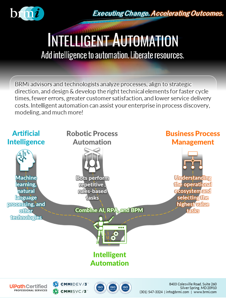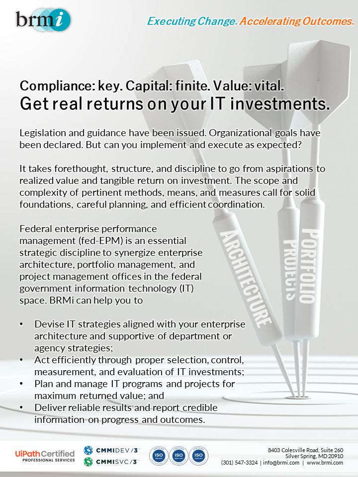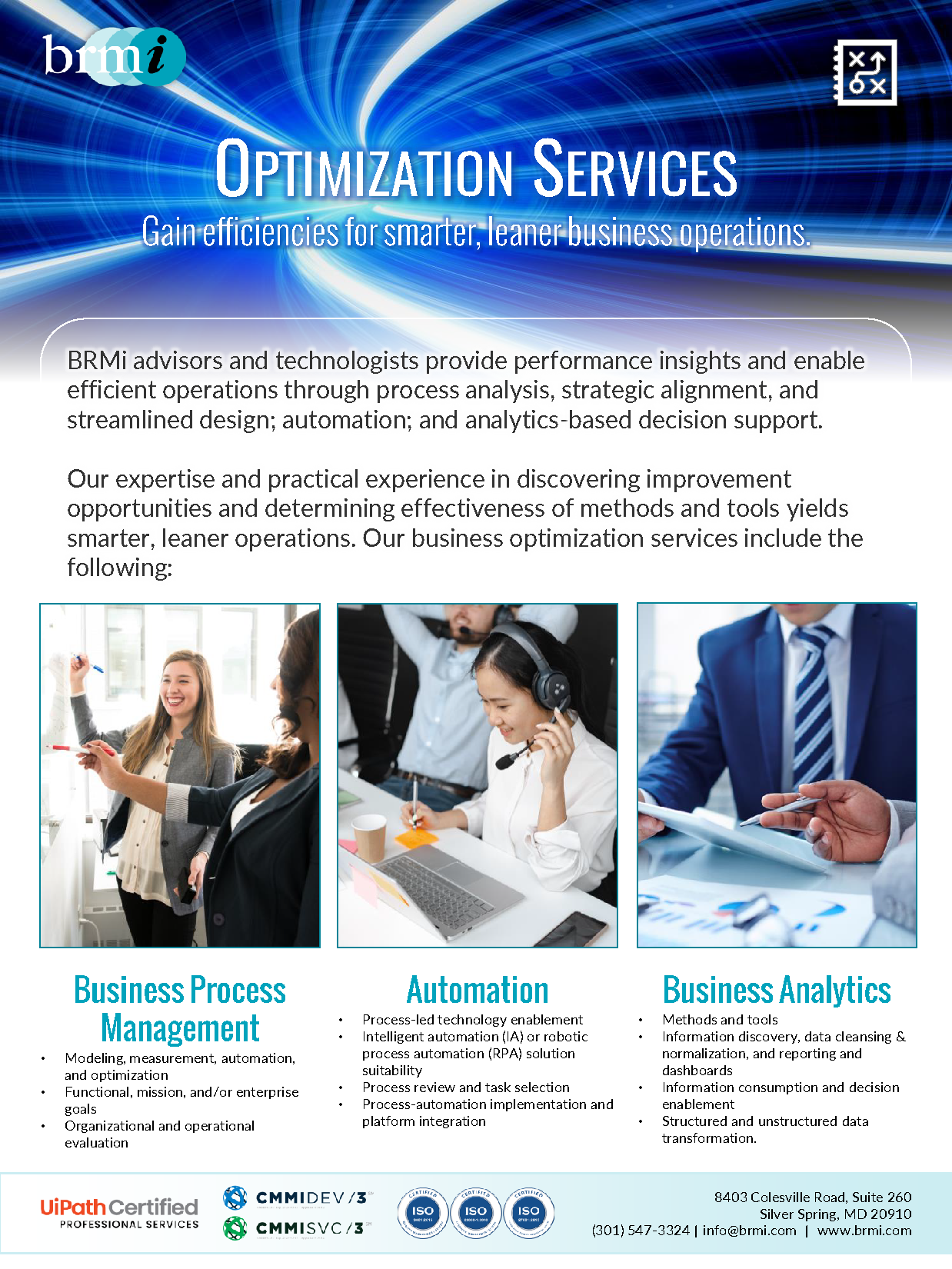 BRMi’s end-to-end information technology services are designed to provide a coherent framework for our government and commercial customers. We’ll help you accelerate and optimize digital transformation, migrate to the cloud, automate, and thrive in today’s e-world.