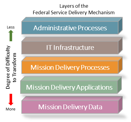 One of the biggest obstacles to reforming services has been the struggle to change legacy mission delivery processes, which is fundamentally hampered by the time and expense of modifying legacy software applications and data stores. Only a small percentage of the federal government’s $95 billion IT budget is available for these types of development/modernization efforts and most of that goes to support legislated and policy changes and security. Yet, significant improvements will be achieved if federal staff are freed from executing the routine tasks that are embedded in these legacy processes.