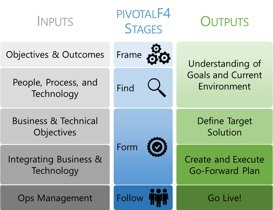 BRMi’s pivotalF4® service delivery framework is combined with our Agile and DevSecOps frameworks to provide guidance to our delivery teams.